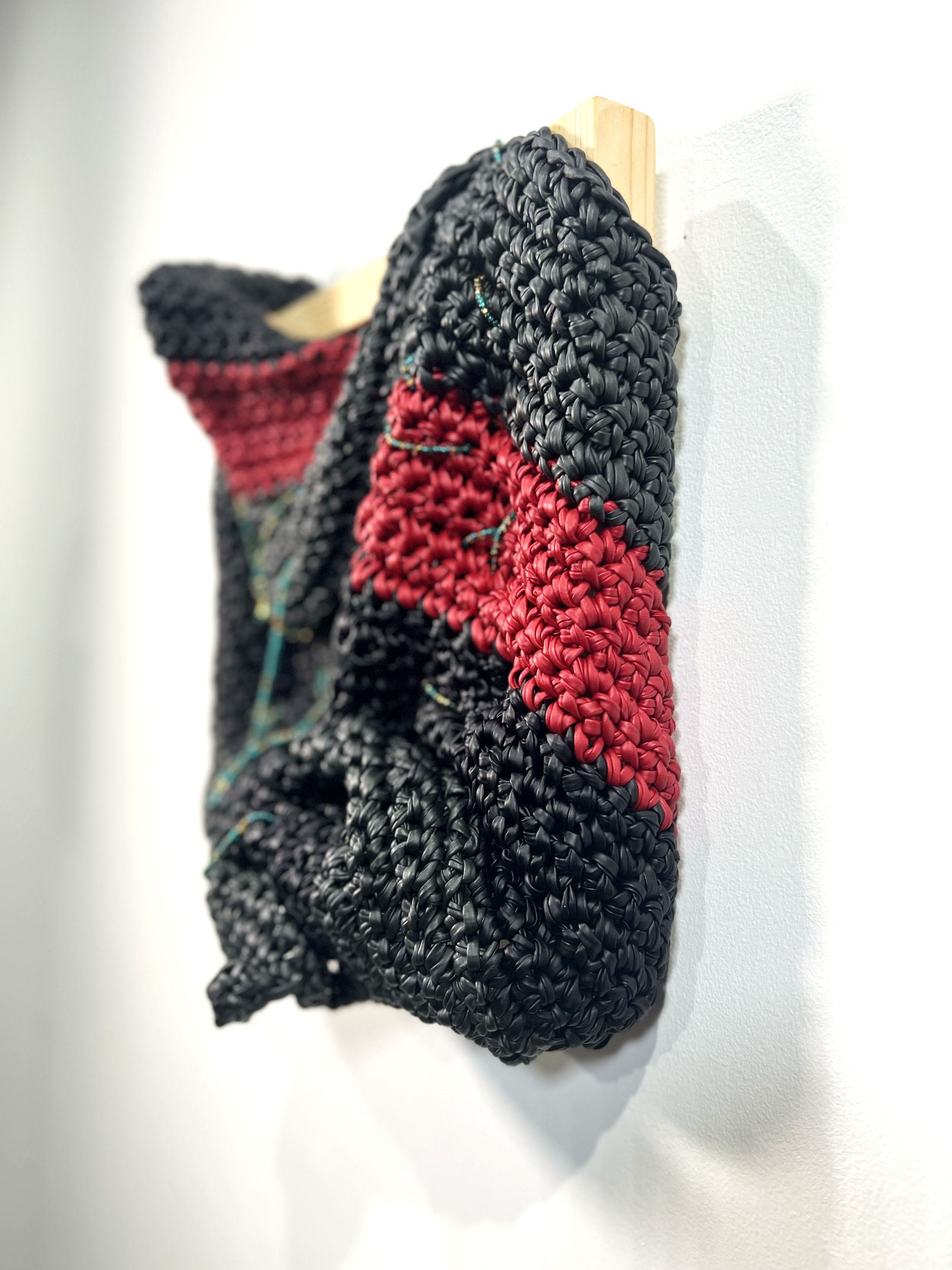 AM I THERE YET 1? 2023. Synthetic leather, Sanded plywood, Seed beads. 13″ x 12.4″ x 3″
