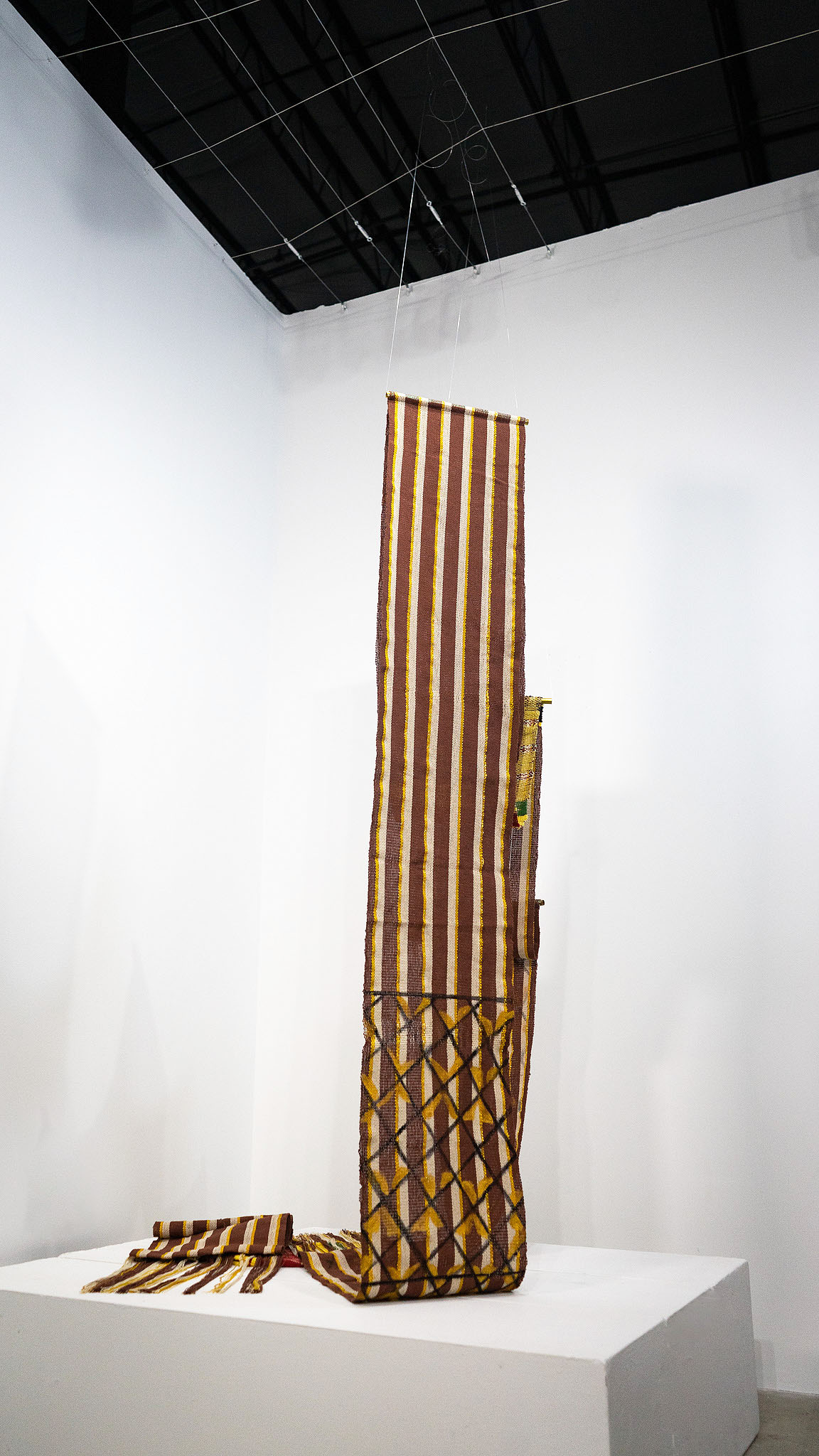 ANUANOM (SIBLINGS), 2023. Kreinik metallic yarn, Silk, Rayon, Cotton yarns & Dowel. 84″ x 38″ x 7.2″
