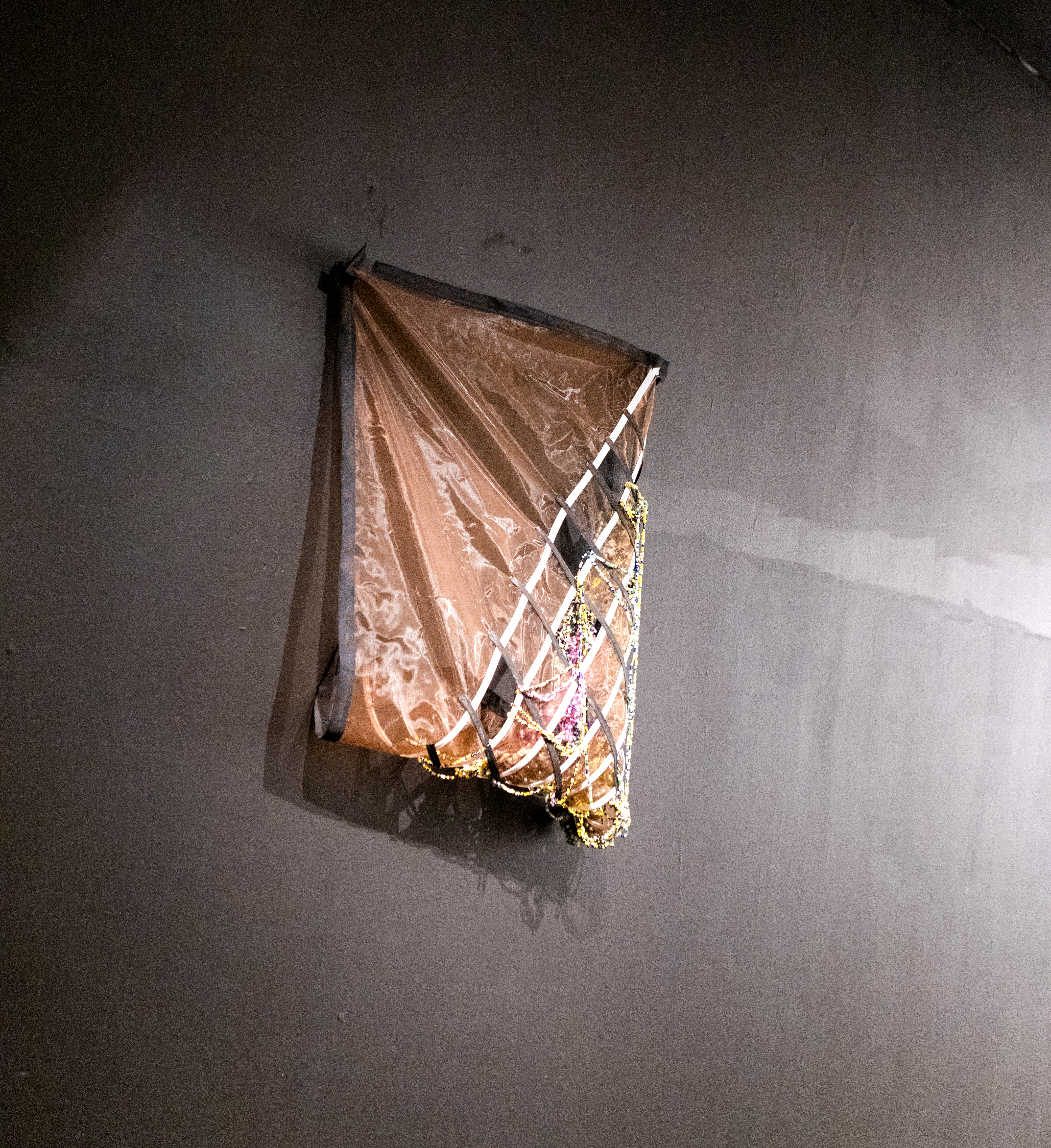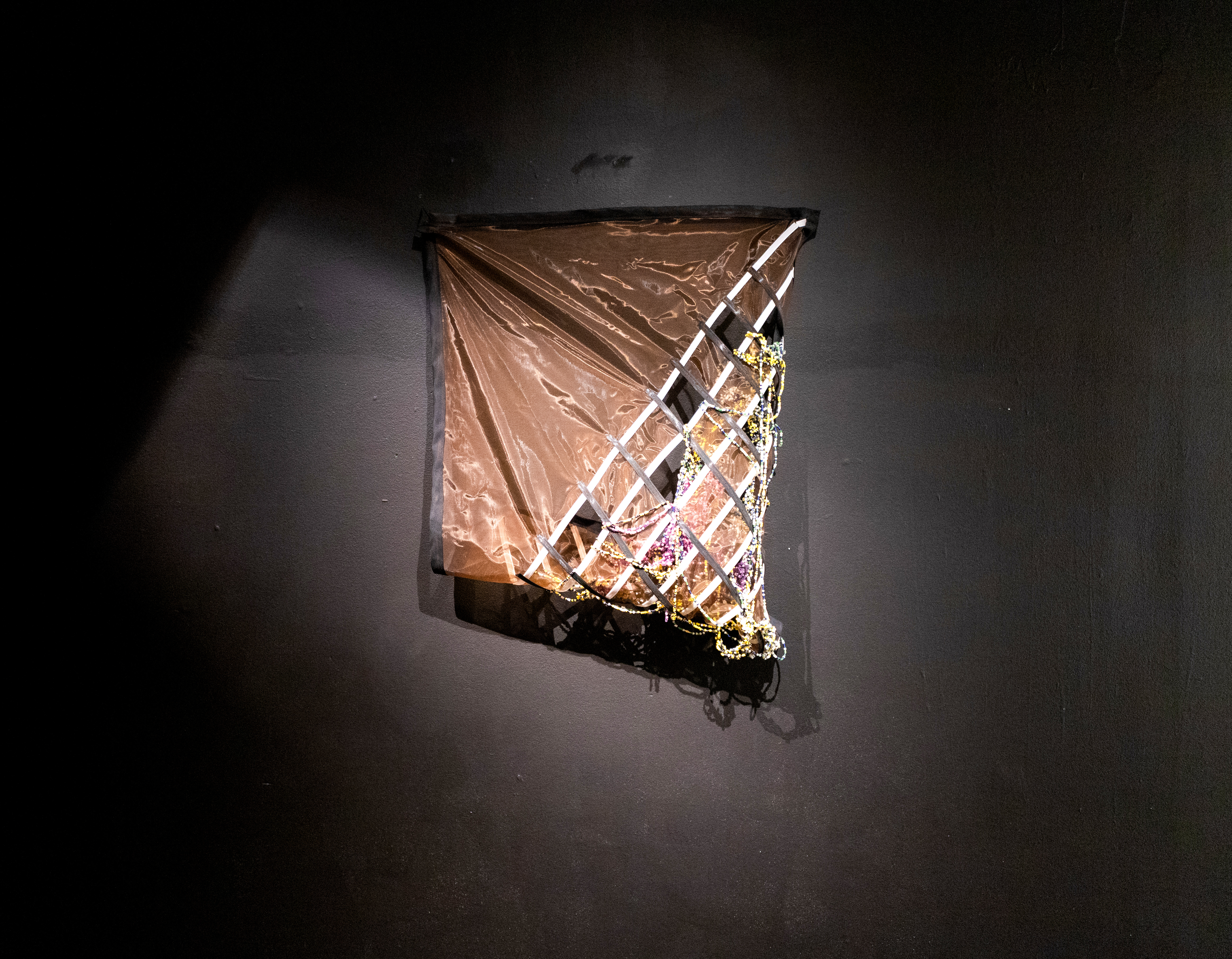 But A Burden, 2025, Bone, Seed beads, Mesh, Cotton