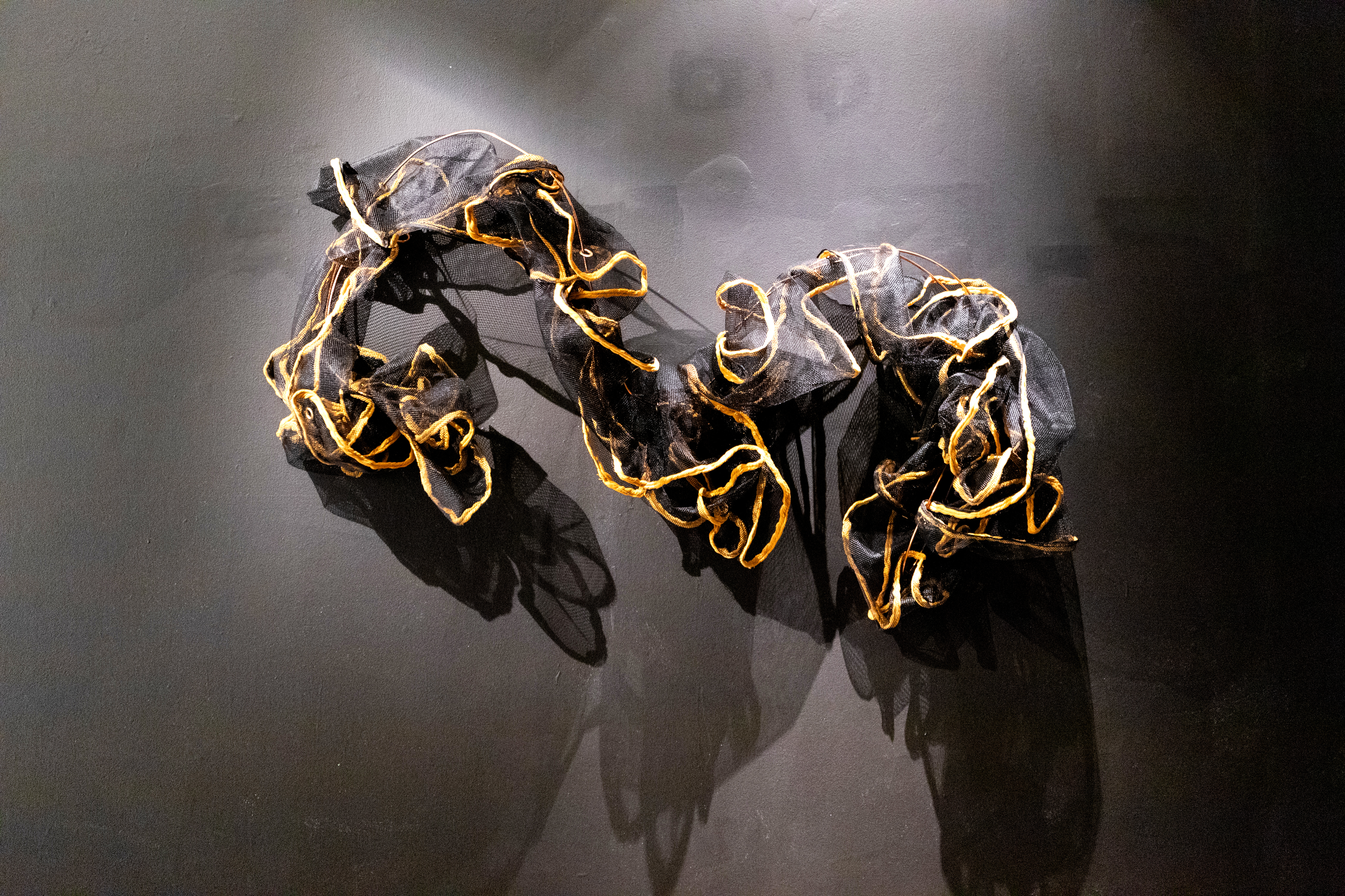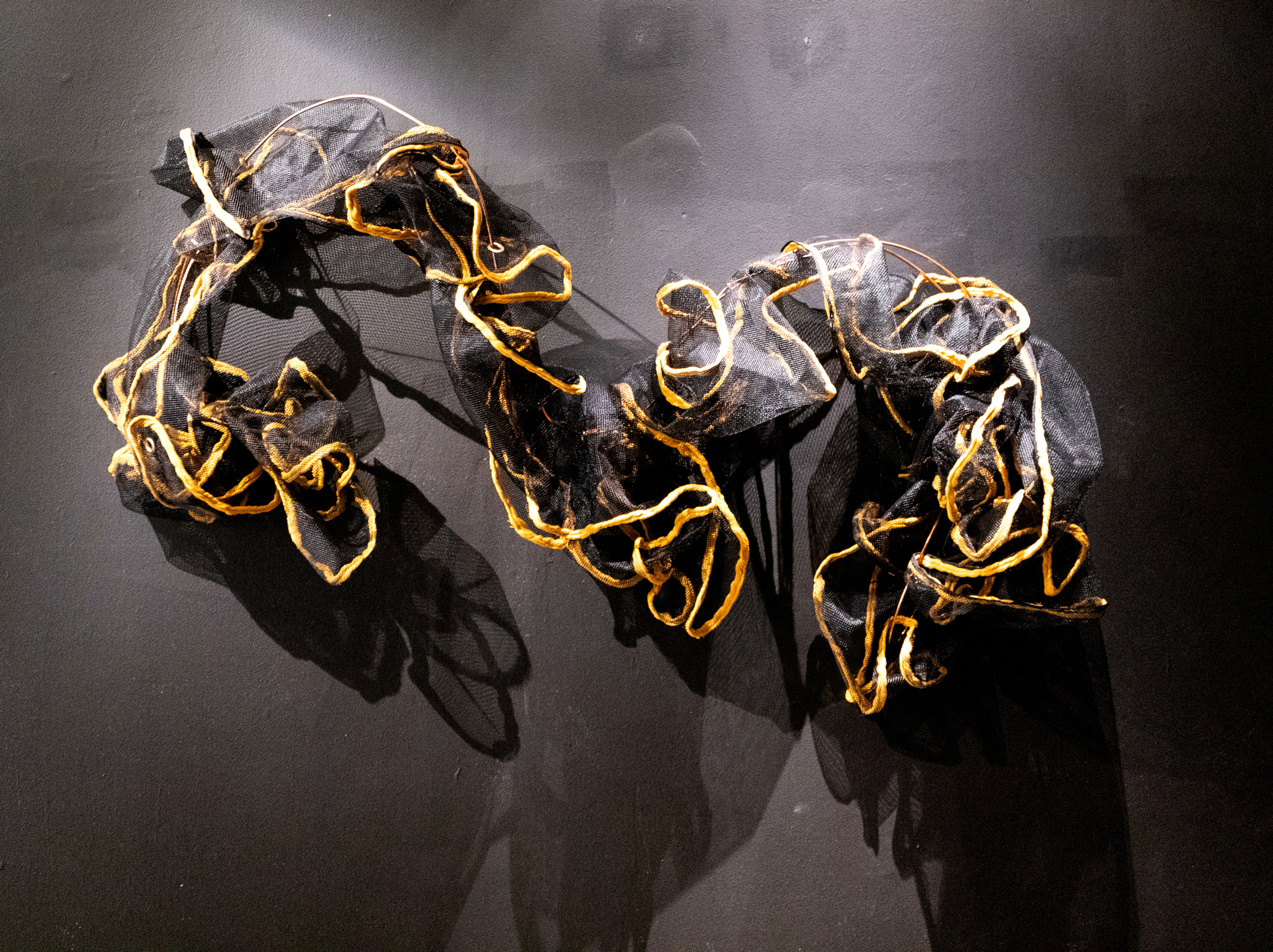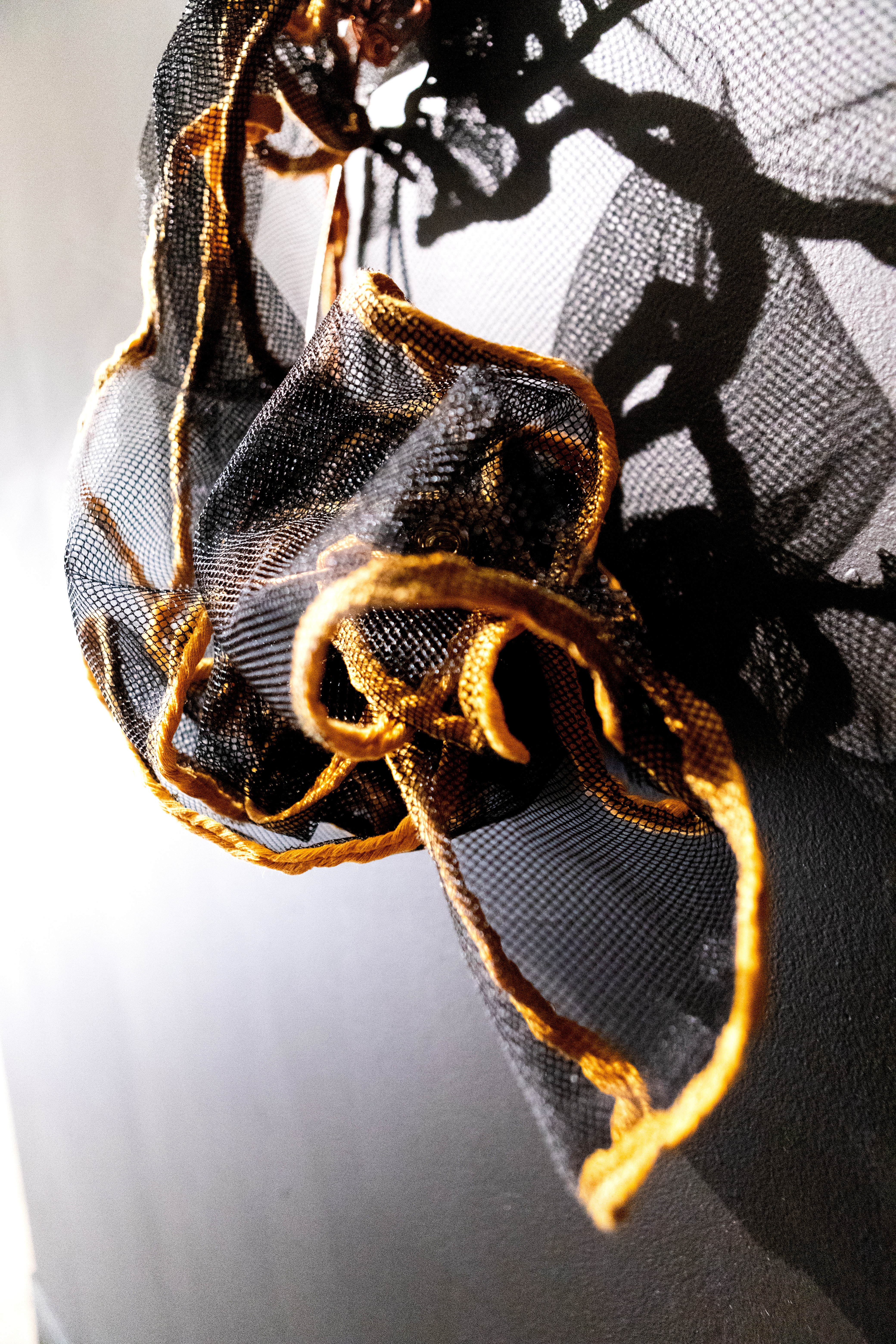 Empty date, 2025, Copper, net, wool, grommet. 64″ x 20″ x 6″