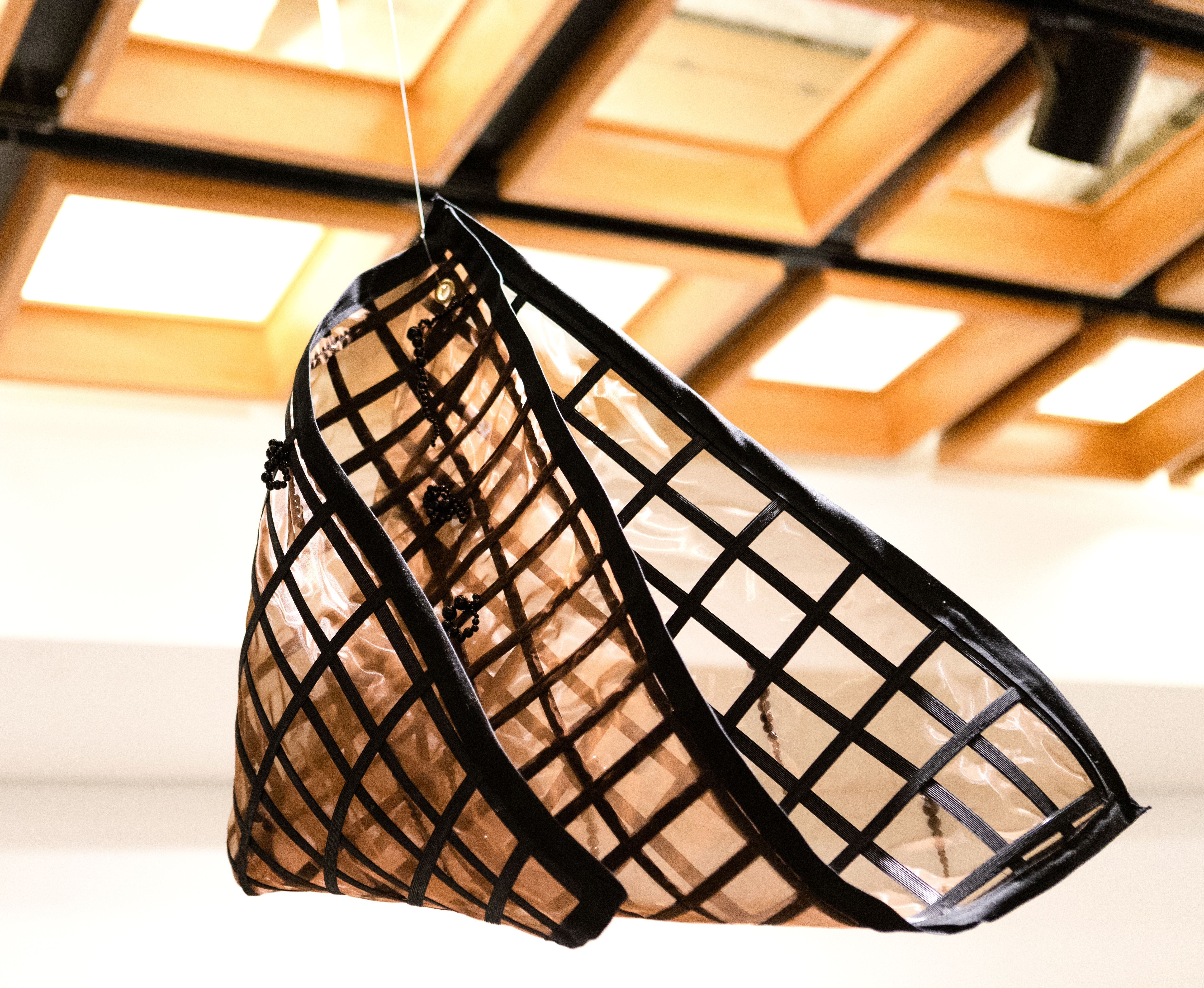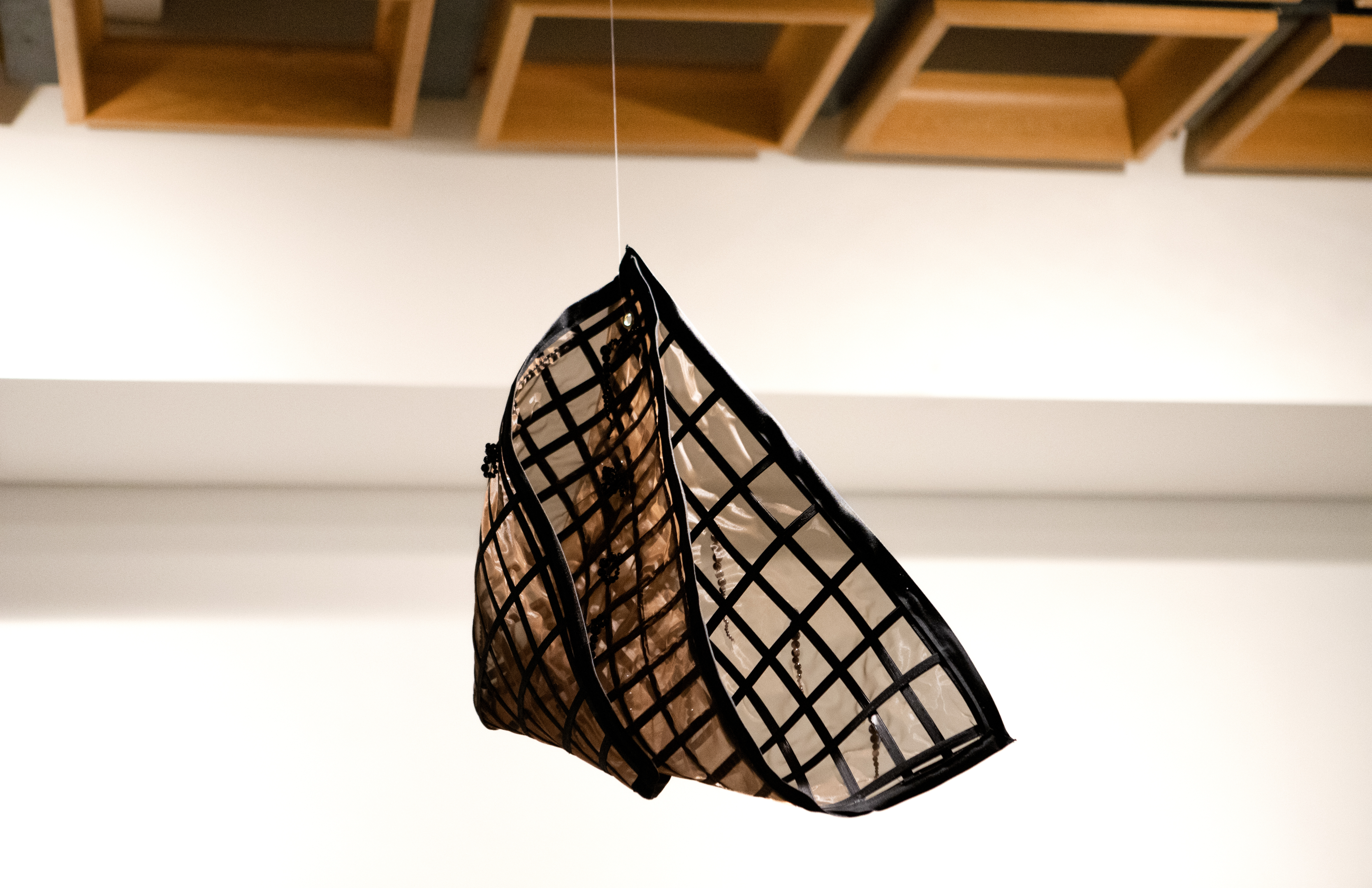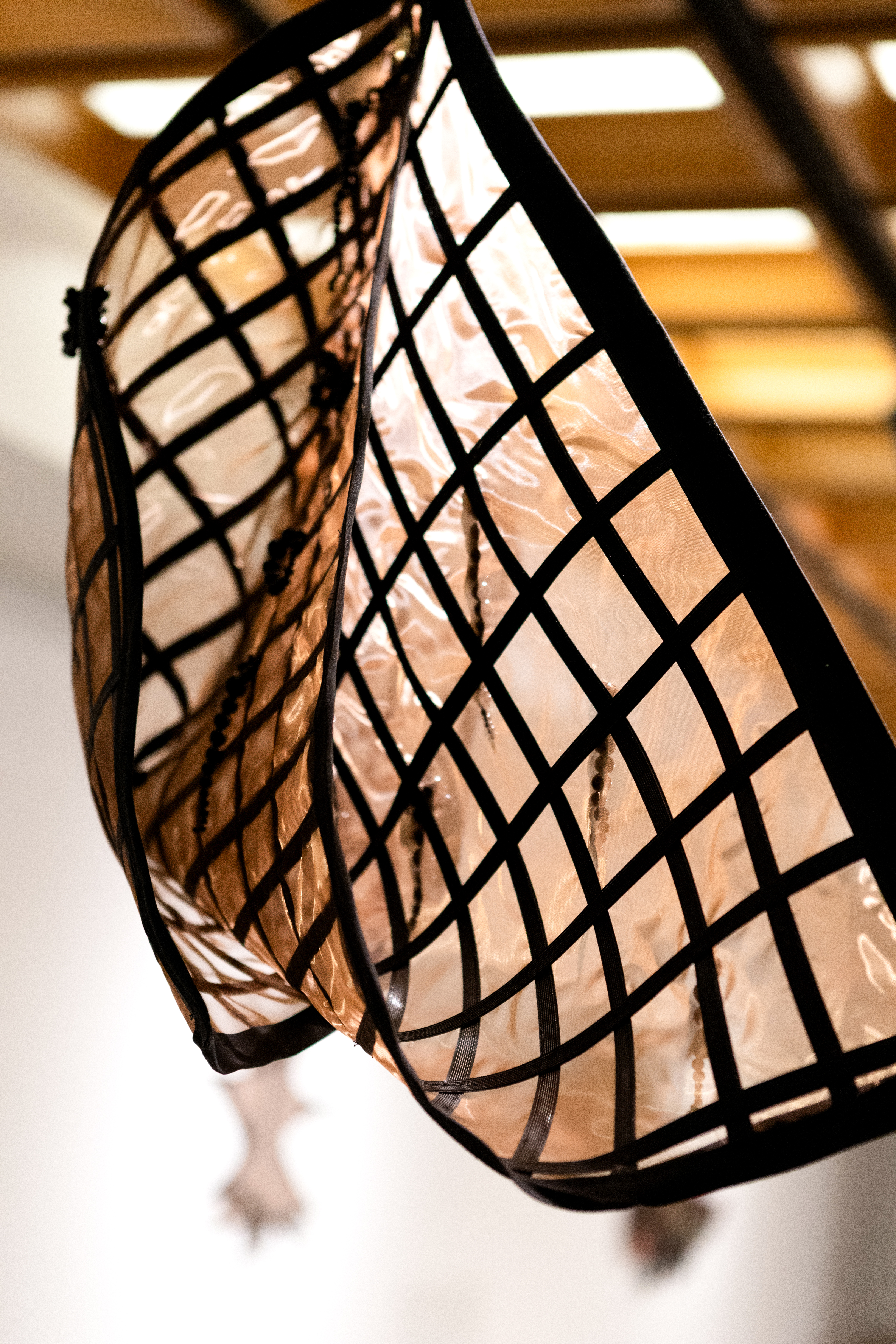 Forget Me, 2025, Corset bone, Mesh, Pearls, Cotton, Grommet. 31.2″ x 17″ x 16″