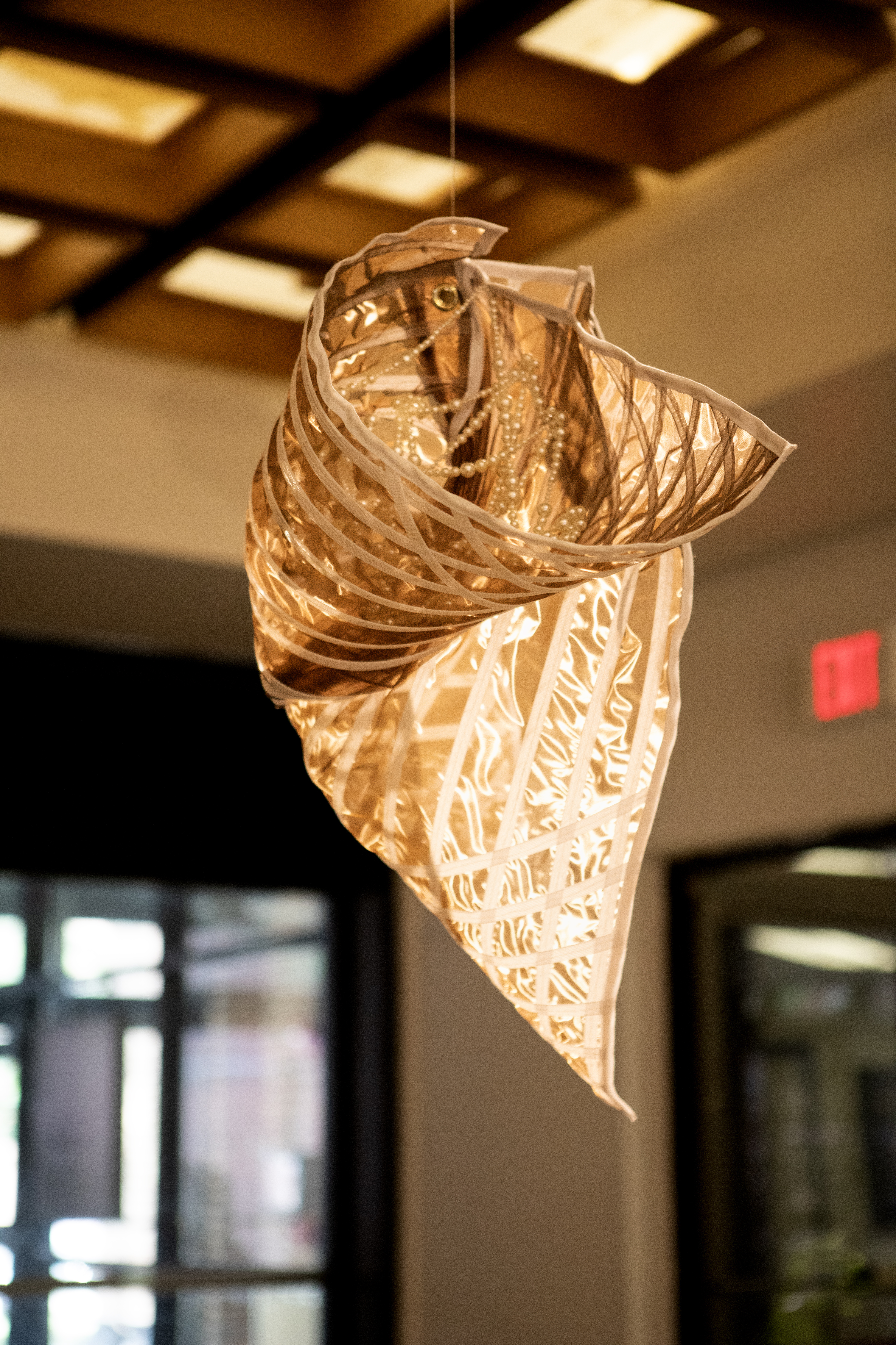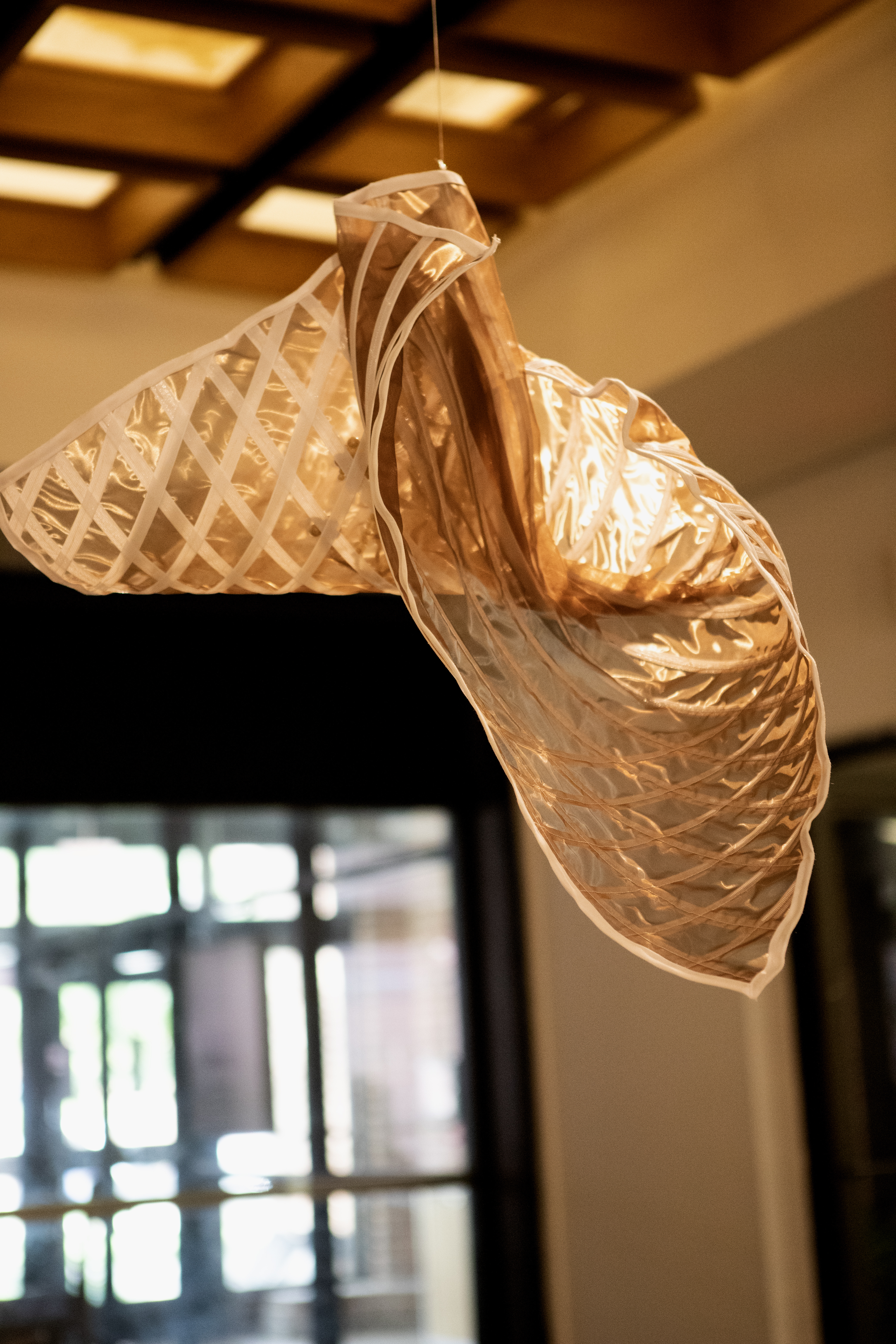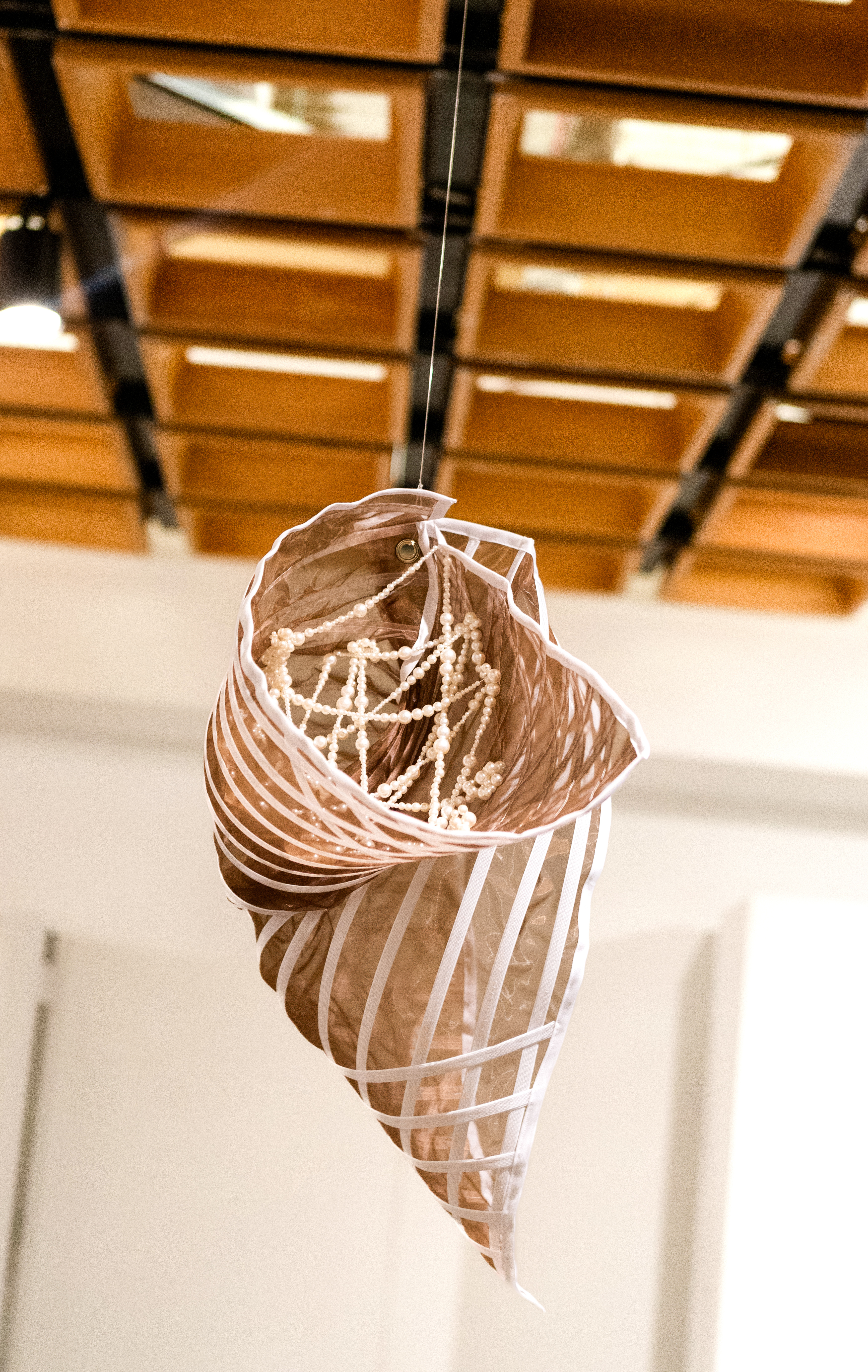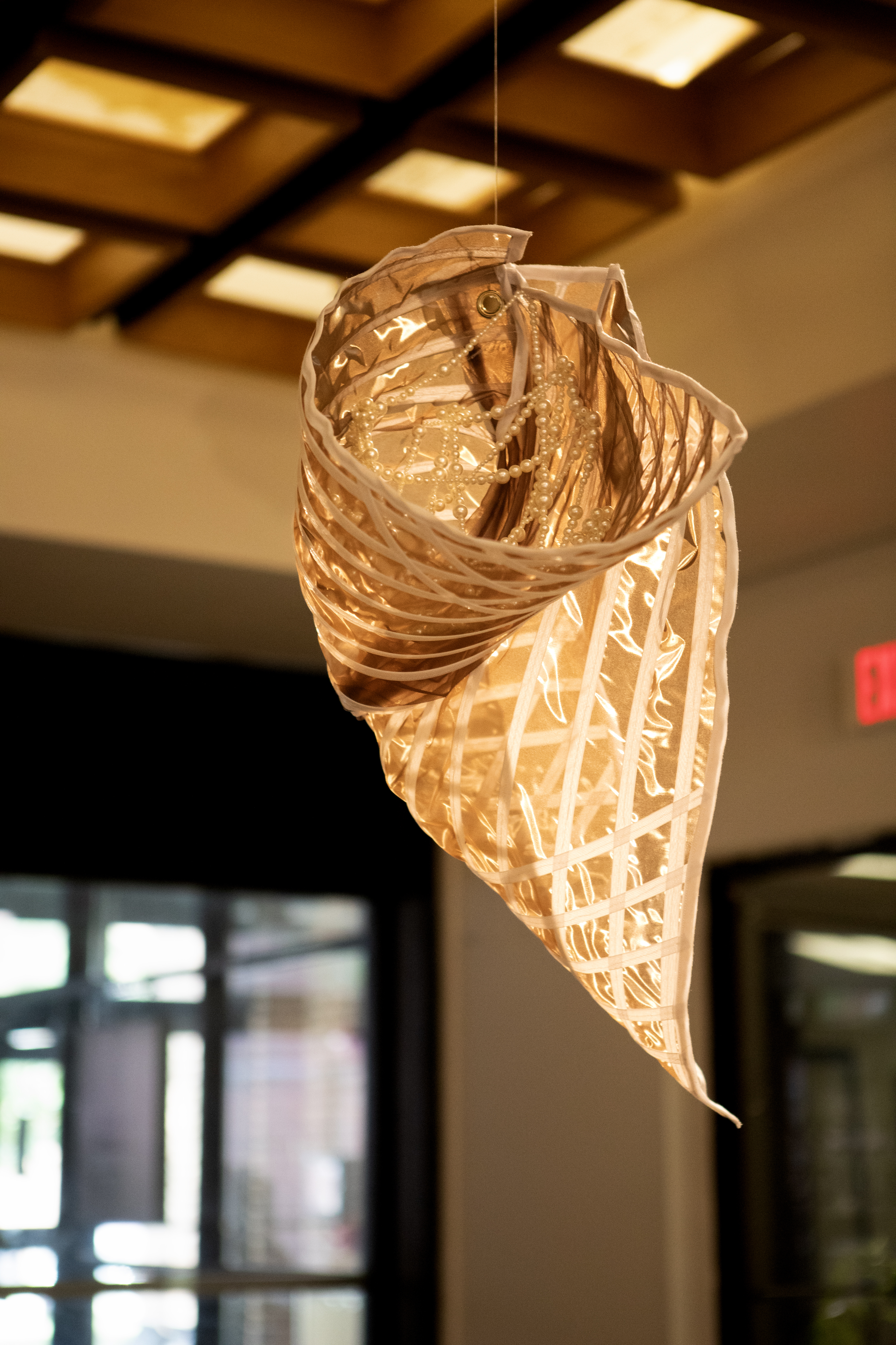 In Whom I am Trapped, 2025, Corset bone, Mesh, Cotton, Pearls, Grommet. 43″ x 13″ x 21″