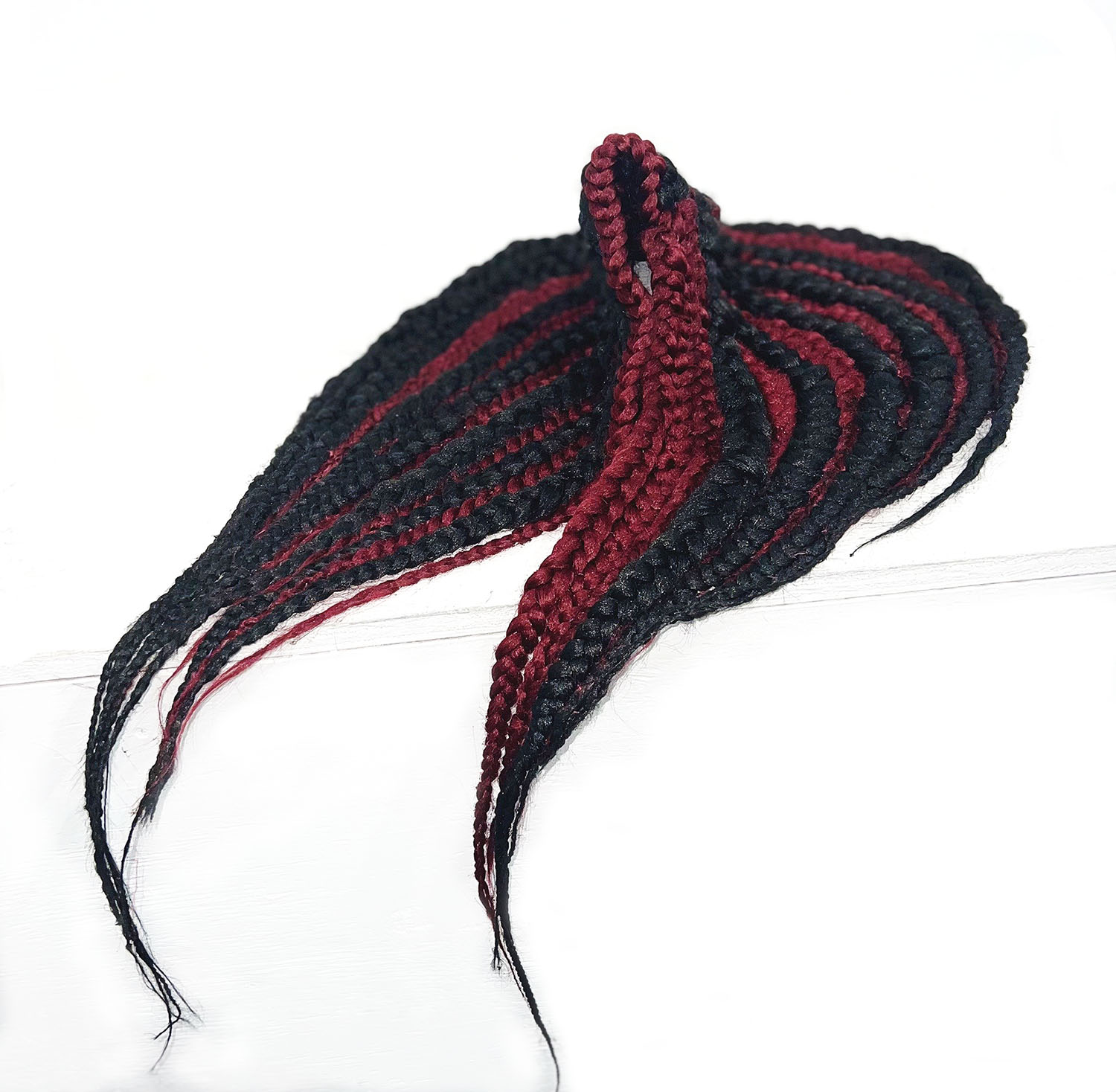 Not Her Hair, 2022. Synthetic pre-stretched hair, Twine. 47.3″ x 16″ x 5.4″